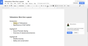 Google Docs is a powerful tool that gives students the space to do more than just type up their work. Students can collaborate with their classmates on a shared document. They can ask for feedback by giving a peer or teacher the ability to comment on their work. It gives students a space to make a plan for their published writing, work through the process and solicit feedback. You might create a template for students to use – a virtual graphic organizer – or jump into their work to leave comments during the writing process.